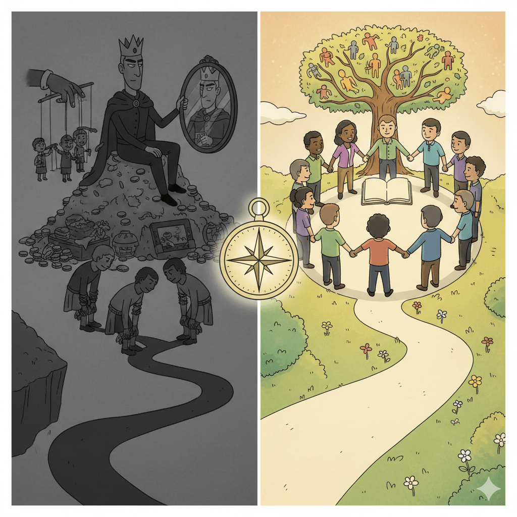 En de paradox is dat er hier toch weer een wij en zij ontstaat, maar het is een wij en zij die een richting bepaalt. Een richting naar ongelijkheid of een richting naar gelijkwaardigheid. Het is een keuze van richting naar stilstand of een richting naar daadwerkelijke groei; en niet materiële groei, maar echte groei als mens.